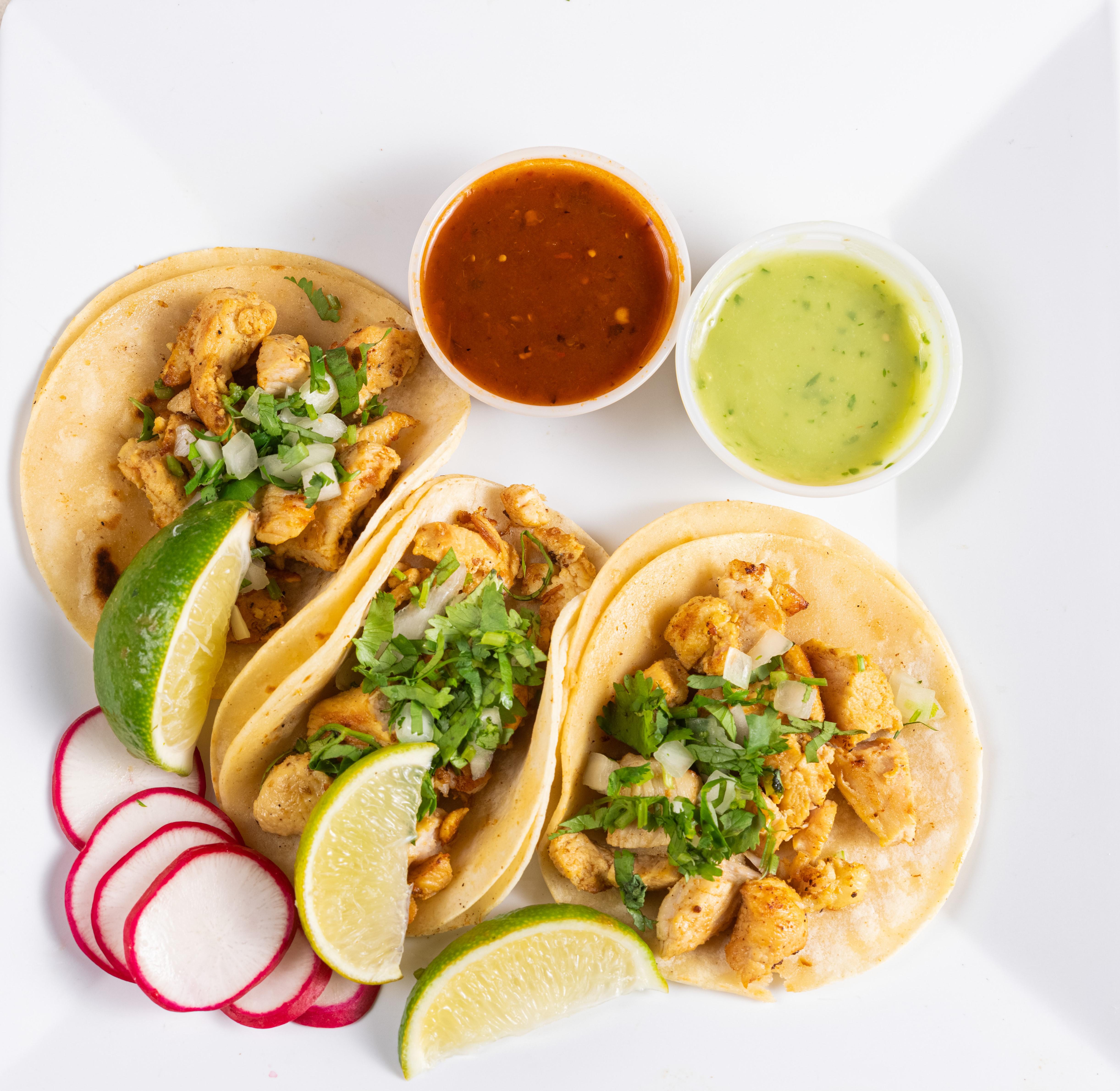 Grilled chicken served on a soft corn tortilla with onions and cilantro, garnished with lime wedges and radish. Accompanied with your choice of salsa verde, salsa roja, or guacamole sauce