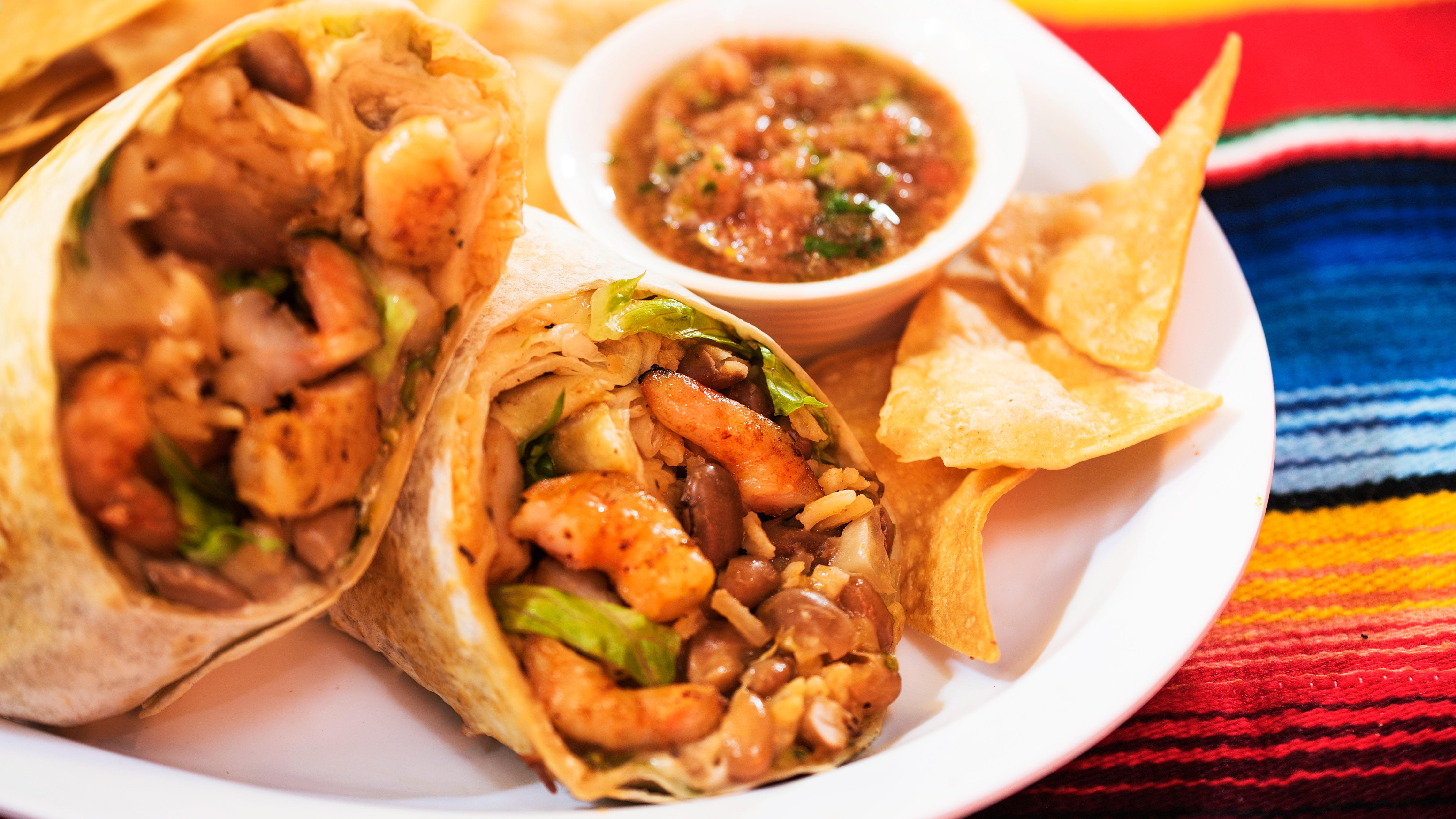 Grilled shrimp wrapped in a warm flour tortilla with Mexican rice, beans, Monterrey jack cheese, lettuce, sour cream and our homemade salsa roja