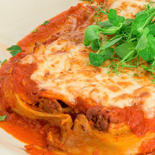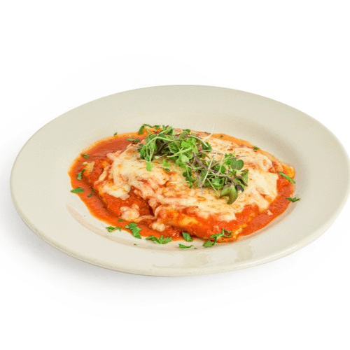 Rolled eggplant filled with ricotta, mozzarella & parmesan cheese, baked with fresh tomato sauce served with a choice of salad or pasta with tomato sauce