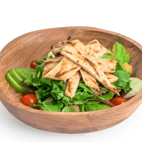 Creamy avocado slices over mesclun lettuce, cherry tomatoes, cucumber, onions, topped with grilled or breaded chicken OR grilled Shrimp