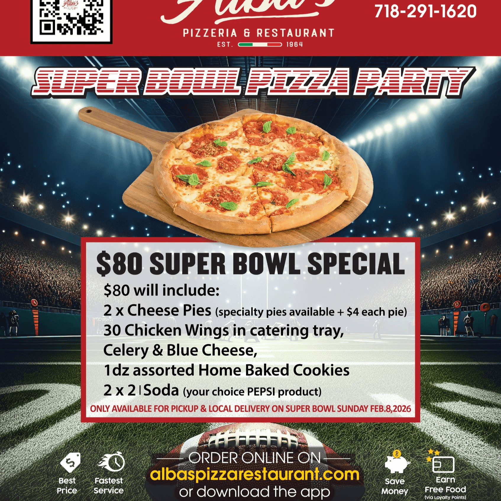 AVAILABLE ONLY SUPER BOWL SUNDAY 02/09/2025 $80 will include: 2 x cheese pies (specialty pies available +$4 each pie) 30 Chicken wings in catering tray, celery and blue cheese, 1 dz assorted home baked cookies 2 x 2 l soda (your choice PEPSI product), please use the special request box to let us know if you need paper plates, cups, napkins.