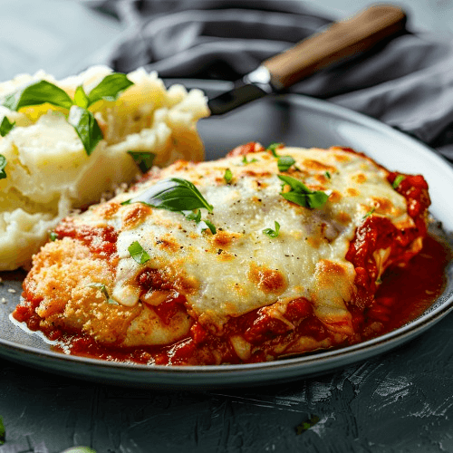 Breaded chicken, eggplant & prosciutto with a wine brown sauce baked with melted mozzarella