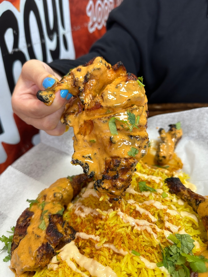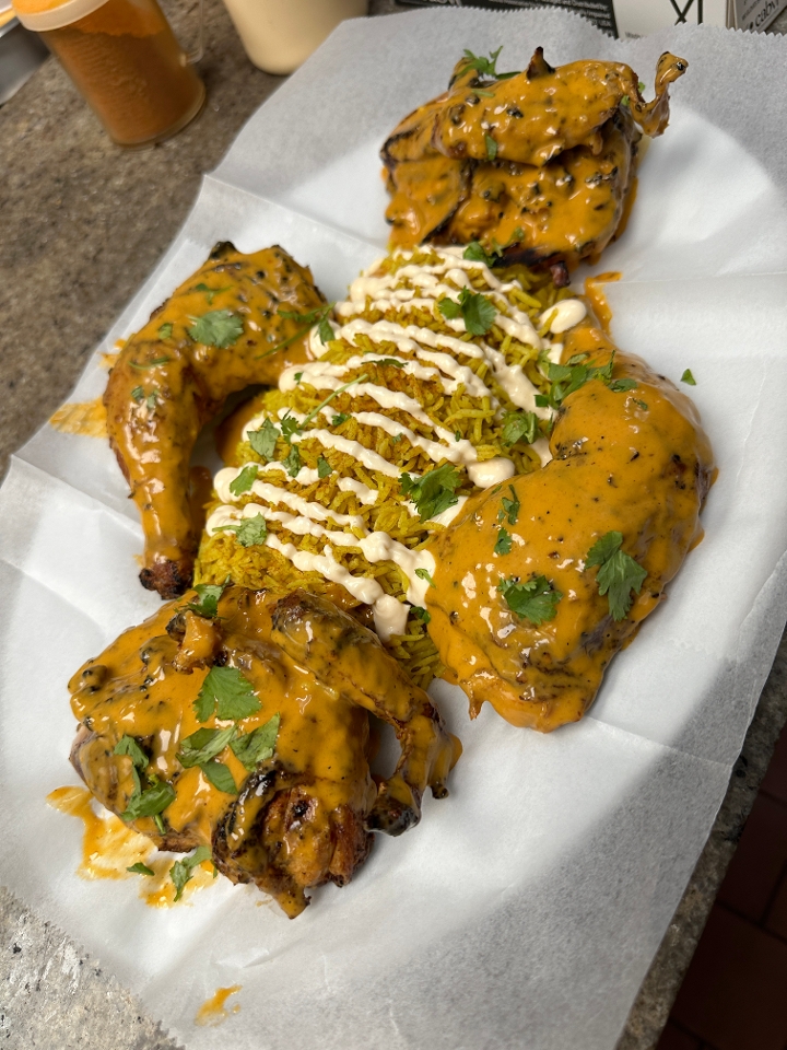 Marinated Grilled Chicken cubes with your choice of Peri sauce with Chicky's Cheese, Chickys sauce, sauteed green peppers and onions.