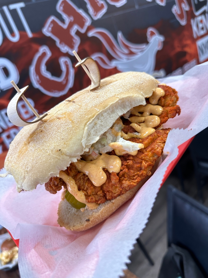 Two Nashville Tenders in a toasted Portuguese roll served with your choice of spice, pickles, coleslaw, chicky’s cheese ( Melted Cheese) and Nashville sauce.